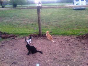 So, finally I got a referral from him to another man who was too busy building fences for others (at least he wasn’t “moving cows”) and he gave me a third referral. After three weeks, the third referral fence man came and I got my new fences up. I must say it was almost worth the wait. He was a perfectionist and it looks great. My cats were first to try it out. It created a sort of gymnastic track for them. Everyone worries about exercise now, you know.
