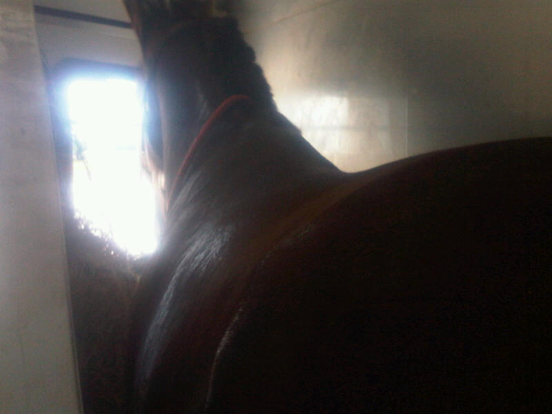 He wasn’t! While he got right in, before we could even get out of the Eq Center, he was rocking the trailer back and forth. We couldn’t imagine what he was doing. We heard banging. We felt jarring movement like we were running on flat tires. It was horrible. At the first opportunity we pulled over and I made the decision to ride in the trailer with Leo. I grabbed my phone and water bottle. Wanting to be stopped as little time as possible we ran to back of the trailer, opened the door, and I scrambled up inside. Lauren locked me in and took off down the highway.