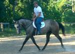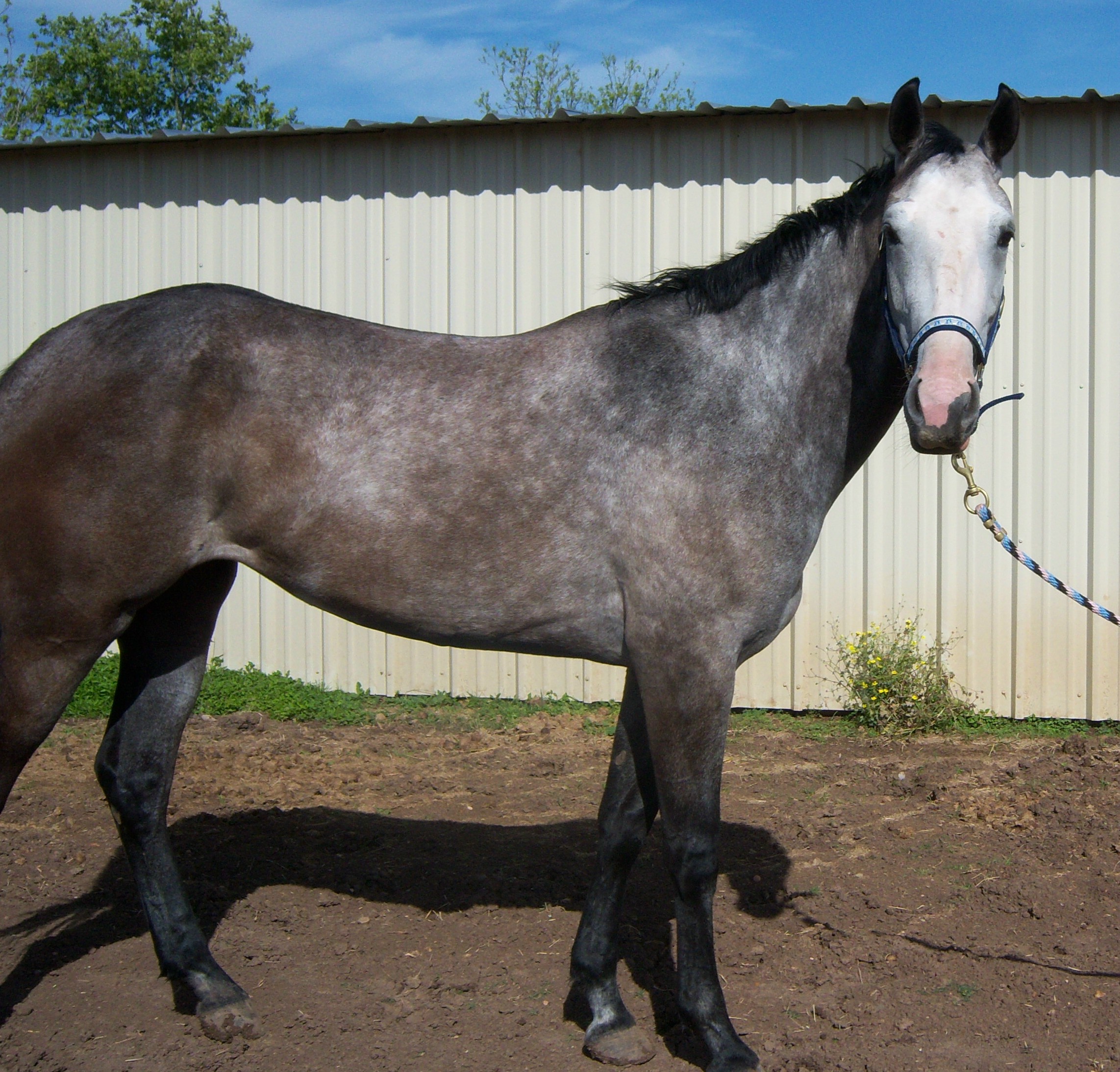 Here is a picture with Mariah in front and Gunner behind. Look at their size difference. Note Mariah’s coat color. Already going grey around her eyes, we knew that as an adult she would be a grey mare. Lauren was sitting bareback on Mariah at 20 months. I was leading Riah with Lauren on board (this in itself was amazing for a young horse to just take in-stride without bucking or objecting). As we got down to her paddock, two of the other horses right next to us, were tagged by the hot wire. They reared and roared off while Mariah just kept trudging along with Lauren on her back.