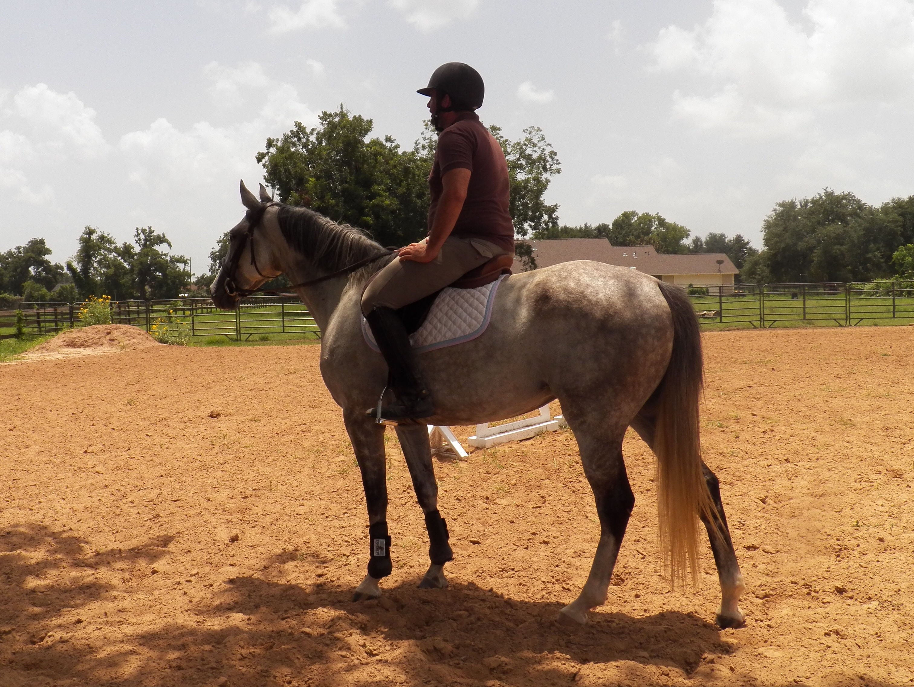Several things led to the lesson actually taking place at Caroline’s compound instead of Dev’s. It meant a much shorter trailer ride for us and with temperatures over 98 degrees that was a good thing. Still we got to Caroline’s around noon and unloaded Feather to find her covered in sweat. We started off with a wet horse and I think she finally dried off and cooled down sometime late that afternoon after we returned home.