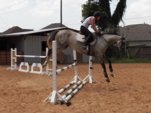 I was ready to see the mare actually go through a few jumps and see how she did. While my picture taking skills were off, I would like to say that I had a great video of Feather over multiple jumps that Lauren accidently deleted. At least I didn’t delete the pictures-I just didn’t get good ones. Here you can see her at the downhill side of the jump. It was 2’9″ and the standards (the posts of the jumps) are five feet so you can see she is clearing it by a couple of feet. The first time to put two jumps together, Feather jumped the first jump well and Lauren cantered her to the next across the arena. Feather stopped right in front of the jump, looking at us as if to say, “who put this here”. But after she saw the jump she jumped it consistently and competently.