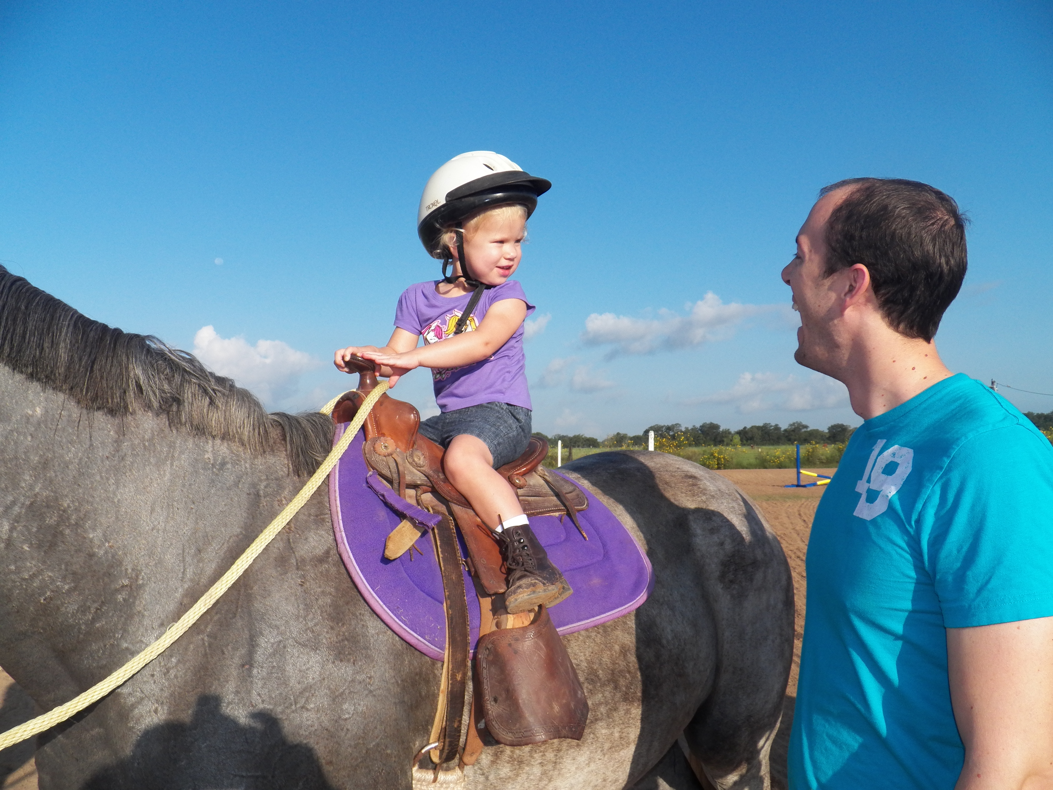 We didn’t really give Zie much time to contemplate if she was going to ride or not. I had her daddy lift her up to the saddle, told her to hold on and off we went. She never looked back. I led her around the ring a few times while her folks were snapping pictures and taking videos. Jordyn wanted Mickey to go over the low jumps (he just walks over them but she calls it jumping). So of course, Micenzie did the same. After a few rounds in the sunny ring, I gave the leadrope over to her parents and they alternated leading the little one on the grey mare around the arena.