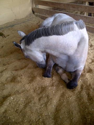 For the first time in Feather’s short life, she got shod on all four feet. It is time for her to start some serious showing, trailering and jumping and we want to support her with good feet. She handled it pretty well. Although she would occasionally attempt to collapse as Roland held up one hoof. It was a pretty neat trick. One I had not seen her do before. She would simply folds her legs under her and start to collapse to the ground. Fortunately, she never made it down. Afterwards, with her new shoes finally on, she laid down in her stall and just took a break. It is hard to be a show horse-even one in training.