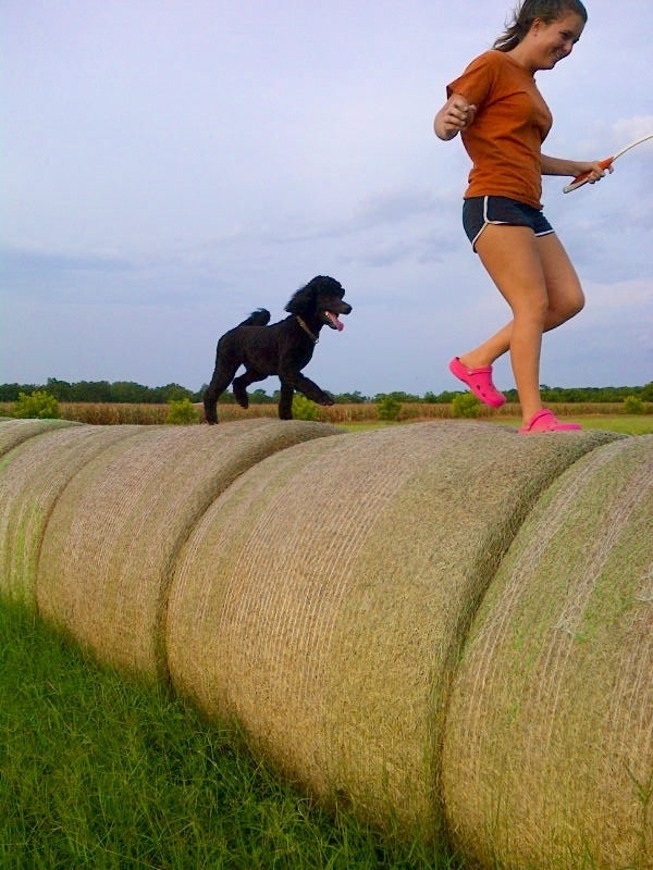 Kona jogging along the hay bale wall as Lauren and I walk along.