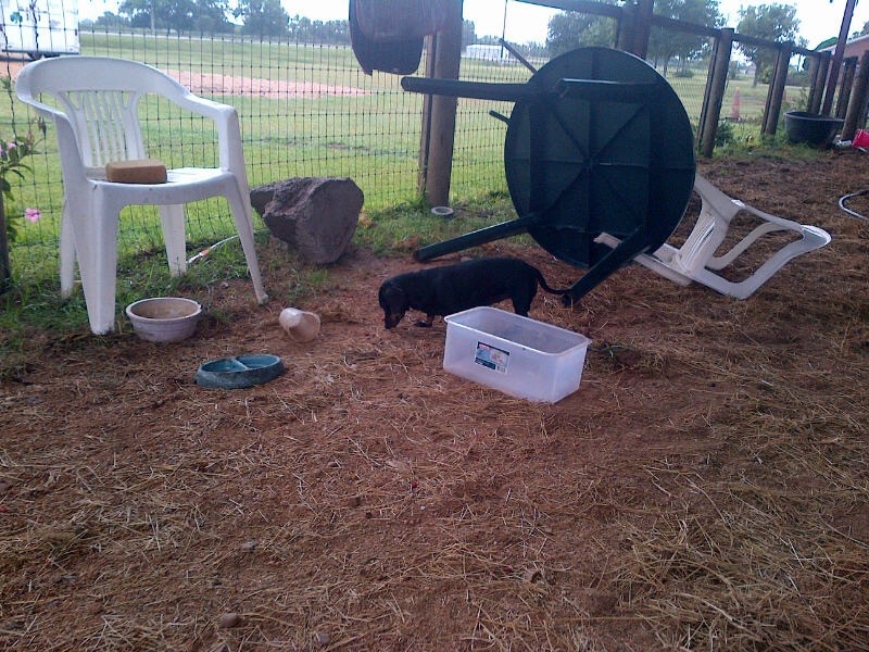 Check out the scene I saw as I got to the barn. Note the round, turned over table, the chairs setting on edge, the bags of shavings ripped open and the empty plastic bin. That bin had been full of cat food. Now Snow was full of cat food! What a mess! Boy, he had cleaned up alright. Every edible morsel of food was gone. It looked like Hurricane Snow had come through the barn.