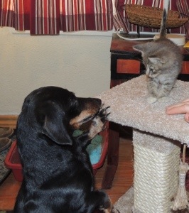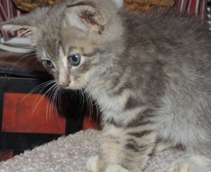 Okay, so you get the idea. Old lady is crawling around parked cars in now wet clothes followed anxiously by a little terrier while seemingly talking to myself. Very odd. Finally, I decided to make a deal with God. “If you want me to take care of this kitten, you let me catch her!” I reached from behind the tire (I know, super tricky!) and grabbed the little cat.