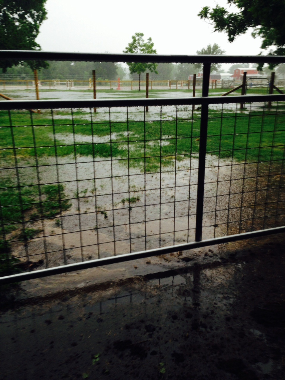 We have had brutal rain showers since Memorial Day. They came in like a wrecking ball (I know, overused words, but so true!) mid-afternoon on Monday. I had gotten the horses (including our new boarder, Cody) into their stalls. My phone started its frightening screeching sound that signifies something really important was occurring and I looked at it to find we were under a “take cover” Tornado warning.