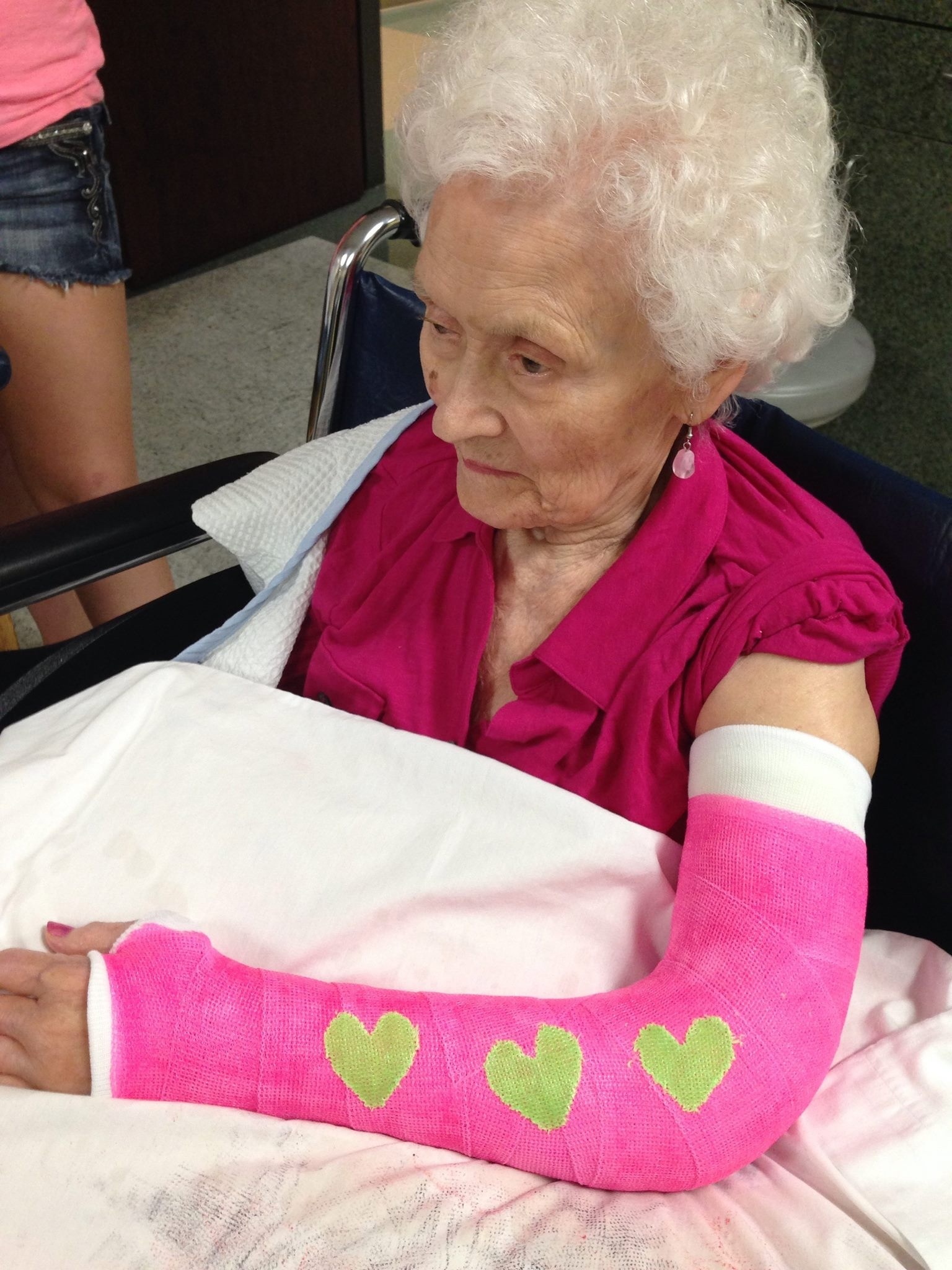 What a trooper! She has loved the many cards she has received. Thank you all for being so kind! It is like a big pink wall of cheer in her room. By Thursday she was getting used to the cast and getting a little happy buzz from the codeine. She walked with her sitter all around the building enjoying some fine Houston weather. When I walked in, she recognized me immediately. ” hi, hon,” she said to me, “you look nice. Did you wear that to work today? “. Maybe someone should study narcotics and dementia because that is the sharpest she has been five years. It was nice to have her back if only for a few minutes.