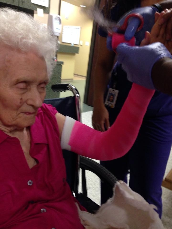 Nanny was pretty sleepy, her pain pills fast at work for what we figured would be a painful experience. But momma brightened up immediately when the nice, good-looking Dr. Rivers stepped into the room. She got a big smile on her face. First thing to do was to get the old splint off and see how her swelling was.
