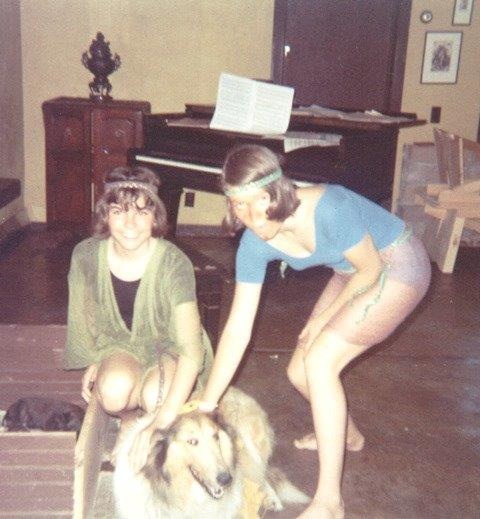 My dad rigged some way for us to go to horse camp in Wisconsin supposedly as sisters.  Here is an awesome picture of the two of us dressed as Native Americans huddling over the camp dog (of course!).