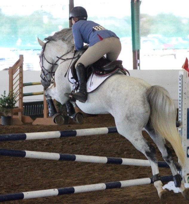 The outside wall is four-foot. Feather takes this big oxer like the wind blowing across the top of it without touching a thing.