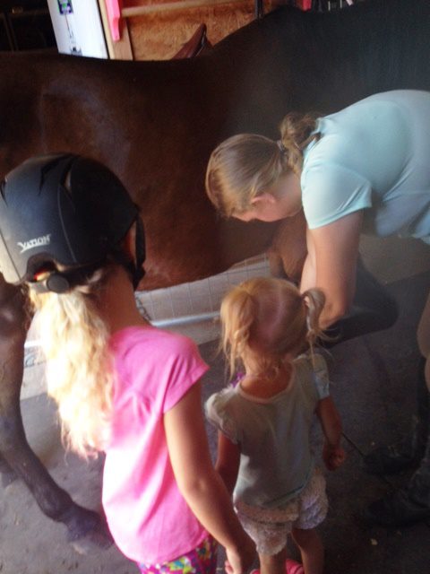 IMG_3116 Published June 22, 2016 at 480 × 640 in Clinic, Camp and the Colt Isabel teaching Madison and Micenzie how to brush the horse.