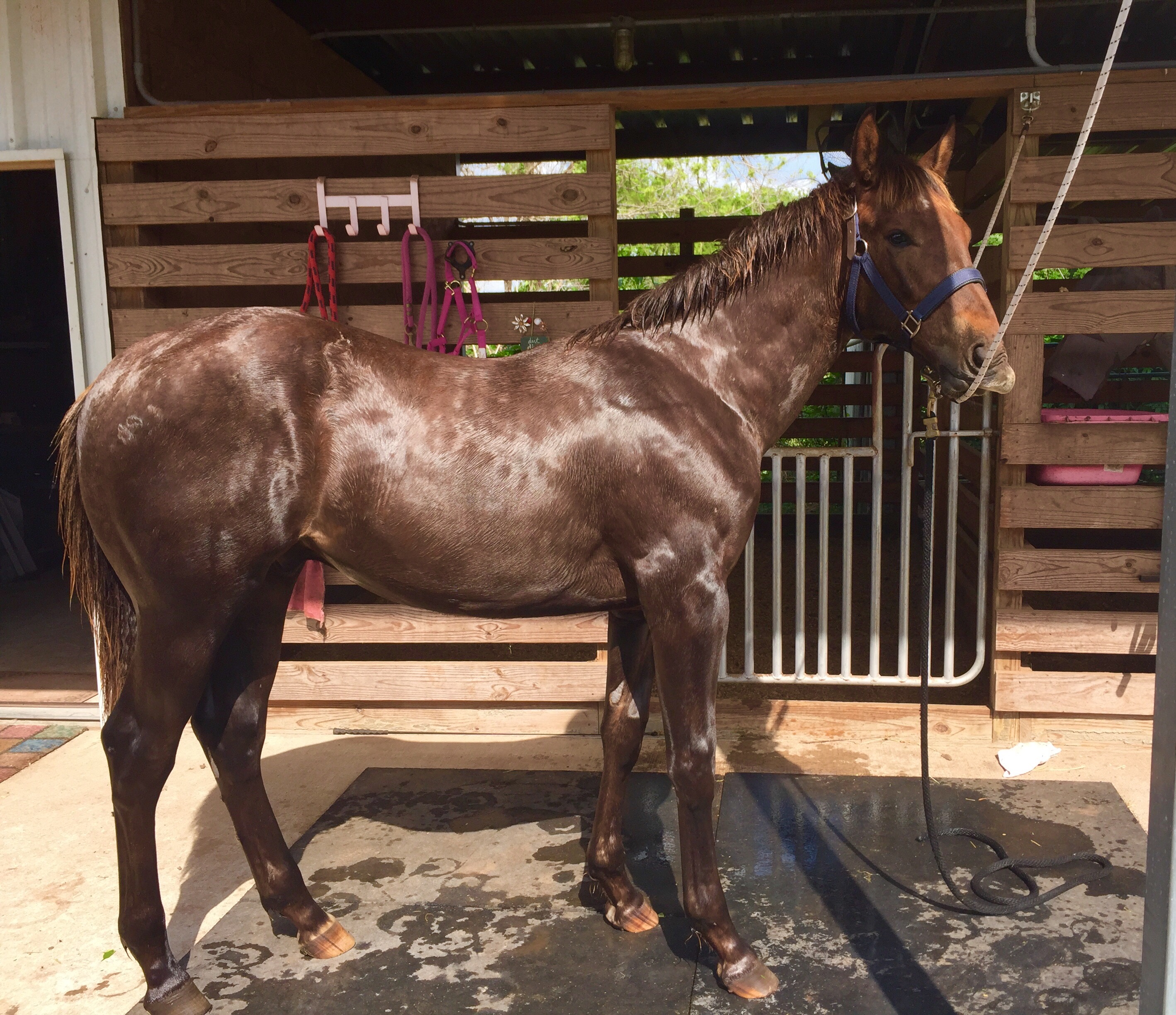 Yesterday, almost one year- old Sims got a little workout and a bath. Not much sign of the grey colt he is going to be, yet.